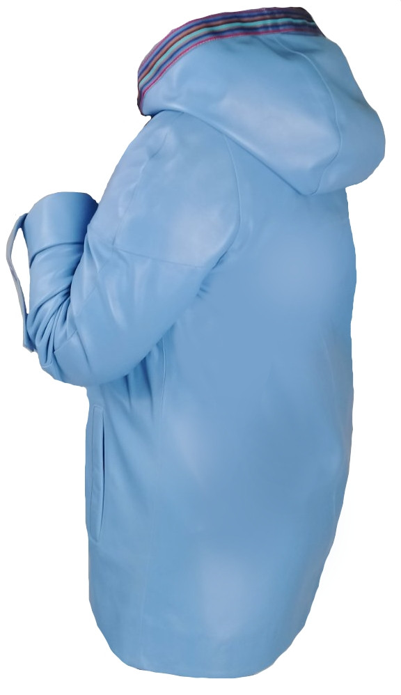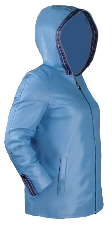 Шкіряна жіноча голуба курточка з капішоном